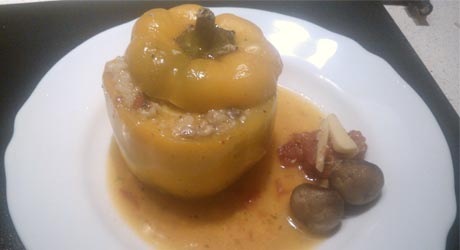 Papryki nadziewamy farszem, nakładamy „pokrywki” i układamy ciasno w żaroodpornym naczyniu wysmarowanym tłuszczem. Wrzucamy całe pieczarki, kawałki pomidora, którego wcześniej sparzamy i obieramy ze skórki oraz posiekamy na plasterki czosnek. Całość zalewamy bulionem.