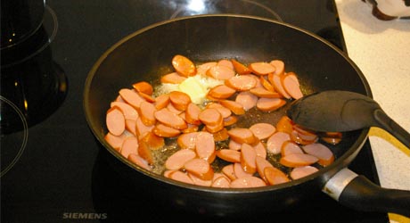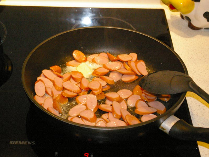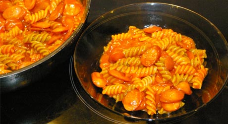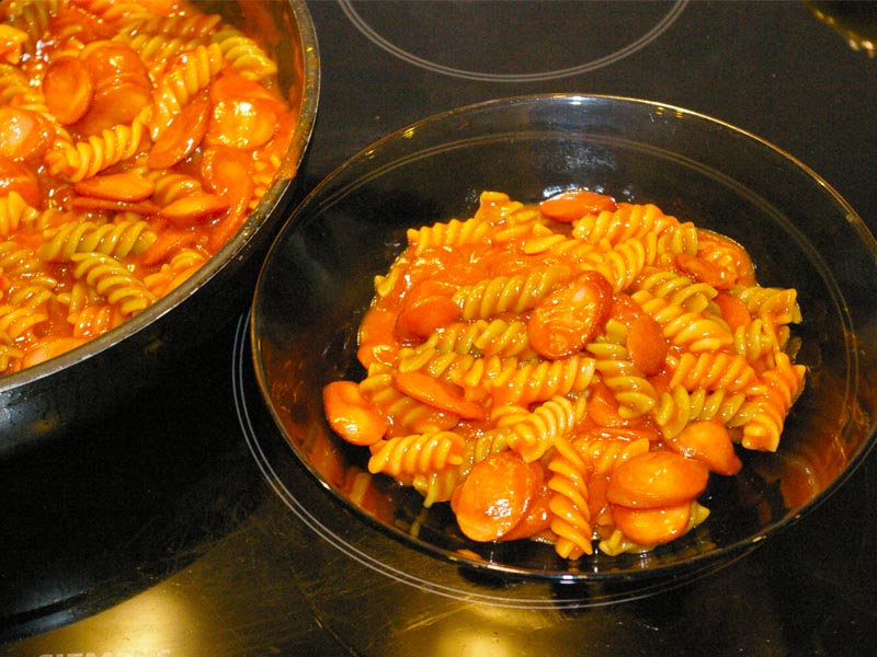 Do sosu z parówkami wrzucamy odcedzony makaron, mieszamy i nakładamy na talerze.
