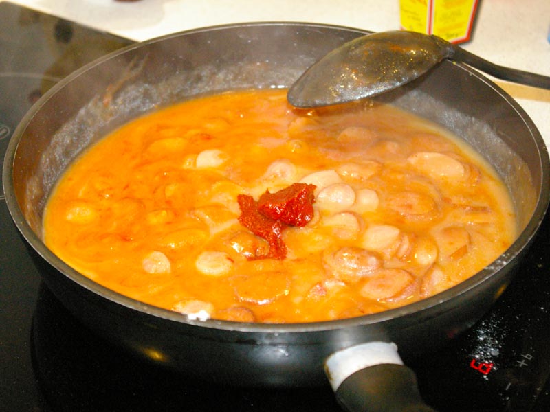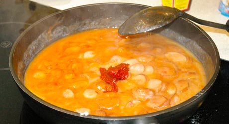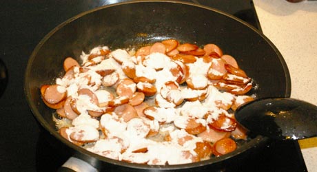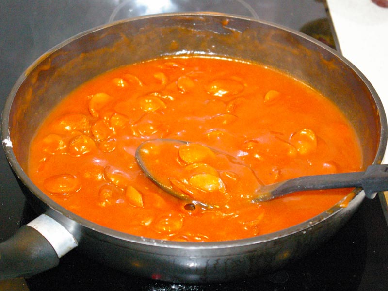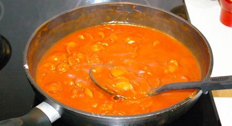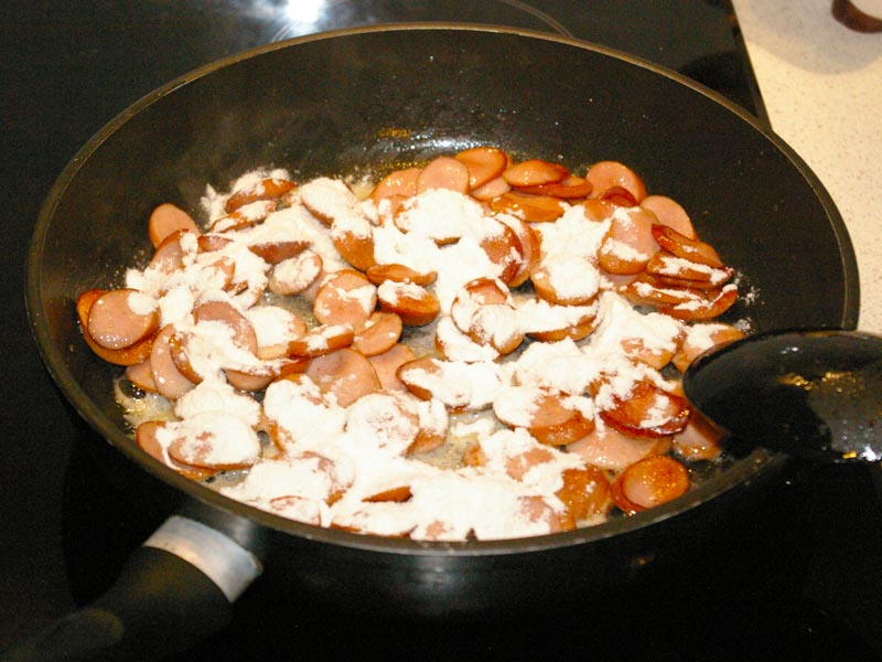 Parówki kroimy po skosie w plasterki grubości ok. 3 mm. Na patelni rozgrzewamy olej i podsmażamy plasterki paróweczek. Posypujemy mąką i przesmażamy minutę mieszając. Wlewamy wodę i dokładnie mieszamy. Kiedy się zagotuje zmniejszamy gaz, wrzucamy vegetę lub kostkę rosołową, koncentrat i keczup. Gotujemy minutkę mieszając.