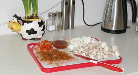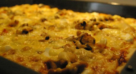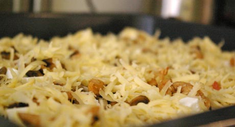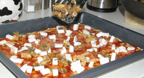 Pierś z kurczaka kroimy w kostkę lub paseczki, przyprawiamy i podsmażamy na niewielkiej ilości tłuszczu. Dorzucamy pokrojone w ćwiartki pieczarki i chwilę dusimy. Fetę kroimy w kostkę, ser żółty ścieramy na tarce o dużych oczkach.