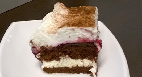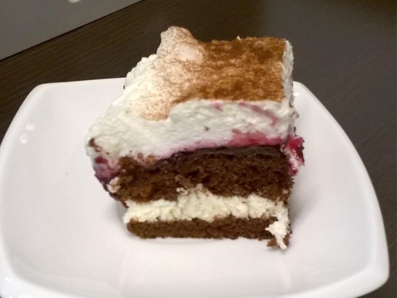 Na pierwszą część ciasta nakładamy połowę dżemu porzeczkowego, na to wykładamy masę serową. Kładziemy druga warstwę ciasta, pozostały dżem i bitą śmietanę.