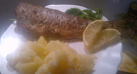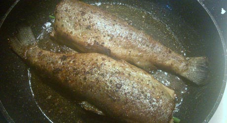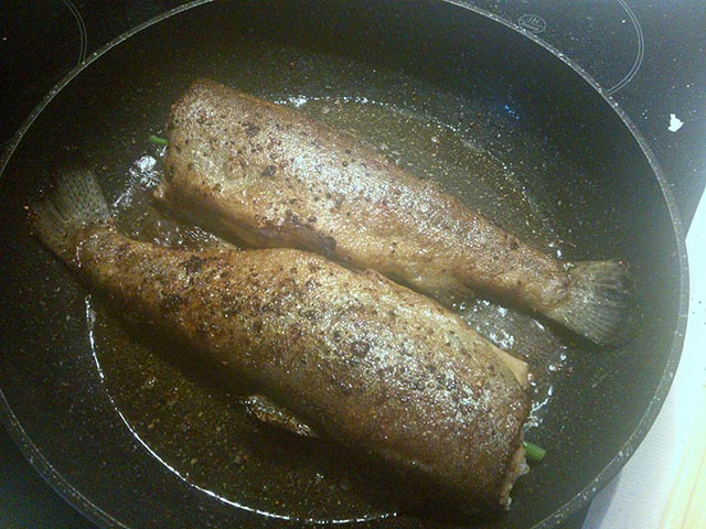 Na patelni rozgrzewany trochę oleju. Układamy ryby, ustawiamy średni ogień i przykrywamy. Zostawiamy tak na ok 7 minut, ale co minutę poruszamy patelnią lub przesuwamy rybę szpatułką, żeby nie przywarła. Obracamy na drugą stronę i powtarzamy czynności.