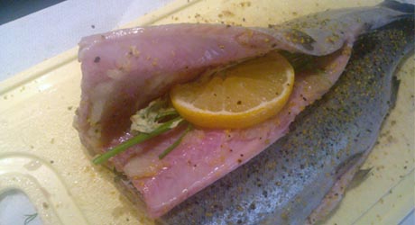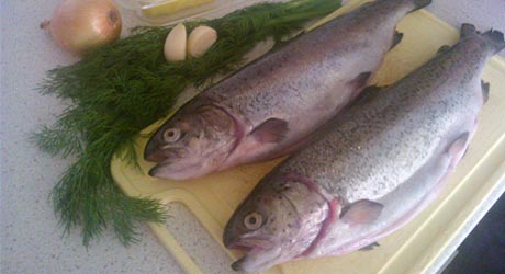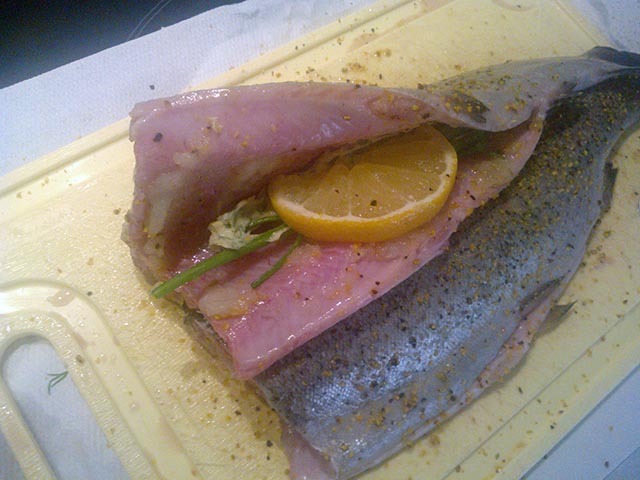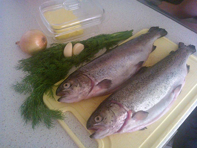 Pstrągi nacieramy z zewnątrz i od wewnątrz solą i pieprzami. Do środka ryby wkładamy po 2 łyżeczki masła, gałązki koperku i po 2 półplasterki cytryny.