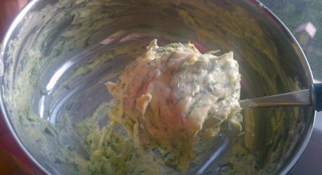 Najpierw robimy masełko. Koperek obrywamy i siekamy. Łodygi zostawiamy - będą nam potrzebne. Czosnek obieramy i przeciskamy przez praskę. Do masła dodajemy koperek i czosnek, solimy i ucieramy do osiągnięcia jednolitej konsystencji.