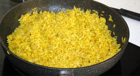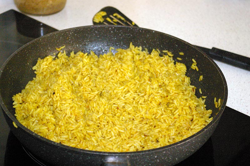 Do ryżu wrzucamy zeszkloną cebule i czosnek, przyprawiamy. I teraz najważniejsze - w naczyniu mamy całą potrzebną ilość zimnej wody. Nad patelnią trzymamy pokrywkę. Wlewamy na patelnię wodę i natychmiast przykrywamy. Będzie bardzo mocno parować :) Zmniejszamy gaz na połowę. Gdy pokrywka przestanie skakać podnosimy ją na chwilę i mieszamy ryż. Dusimy tak ok. 15 minut co jakiś czas mieszając - im dłużej się dusi - tym częściej mieszamy. Gdy ryż wchłonie całą wodę wyłączamy gaz i smakujemy - jeśli jest już odpowiednio miękki to zajadamy, a jeżeli jest jeszcze zbyt twardy zostawiamy pod przykrywką na kilkanaście minut.