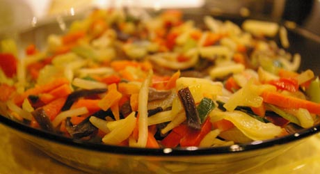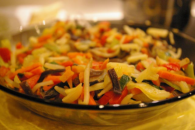 Na patelnię wlewamy trochę oleju i wrzucamy zamrożone warzywa, solimy. Smażymy na dużym ogniu ok. 10 minut. Cały płyn musi odparować a warzywa muszą być twardawe.