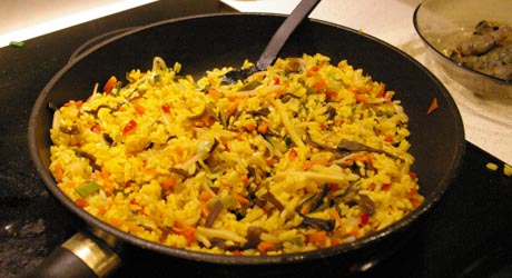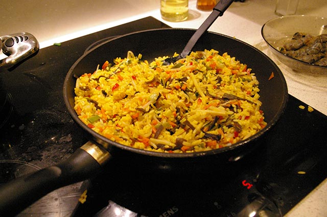 Na patelnię, na której smażyliśmy warzywa dolewamy trochę oleju i wrzucamy ryż. Posypujemy kurkumą i curry i smażymy na dość dużym ogniu przez 5 minut. Musi dobrze odparować i być sypki.