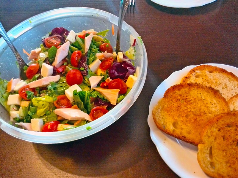 Mix sałat łagodnych ma: sałatę rzymską, endywia frisee, cykoria radicchio i troszkę marchewki. Kupuję go w biedronce i do sałatki daję pół paczki, ale kiedy nie mam go akurat w domu zastępuję dwiema garściami porwanej sałaty lodowej. Wrzucamy ją do dużej miski.