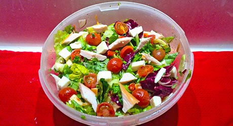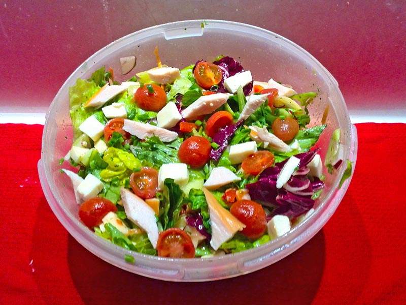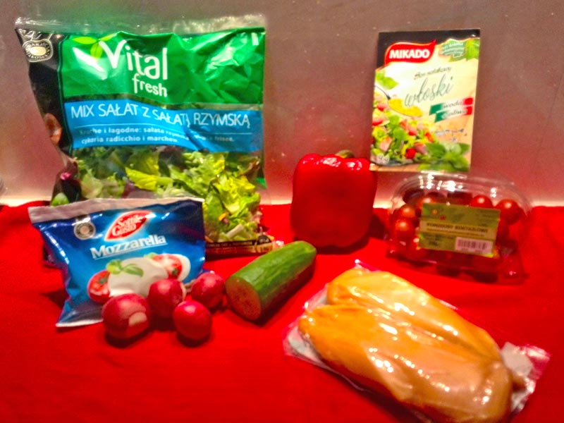 Mozzarellę i kurczaka kroimy w kostkę. Ja najczęściej używam fileta z piersi kurczaka. Dorzucamy do sałaty.