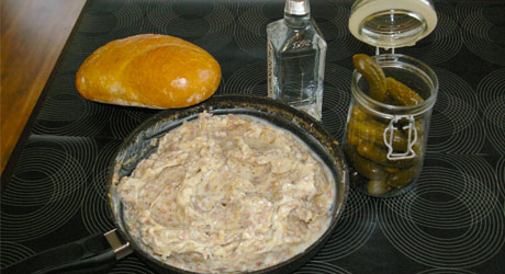 Na patelnię dokładamy mięso mielone. Posypujemy solą, pieprzem i majerankiem i smażymy mieszając. Po zrumienieniu dokładamy do smalcu ze skwarkami i całość mieszamy. Pozostawiamy do wystygnięcia w temperaturze pokojowej. Przechowujemy w lodówce.