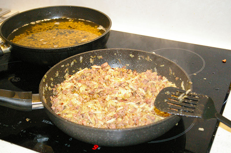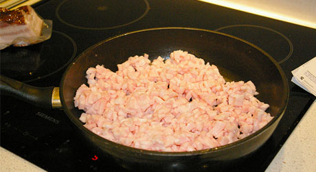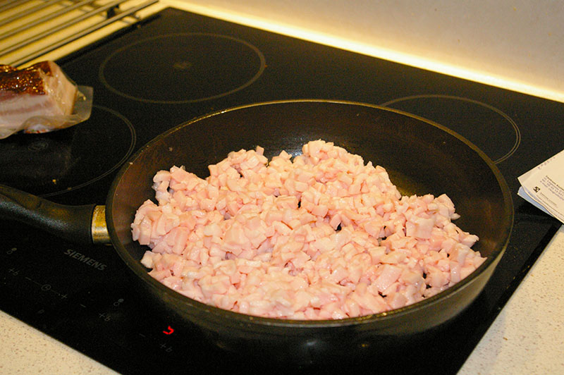 Boczek mielimy lub kroimy w drobną kostkę i dorzucamy na patelnię.