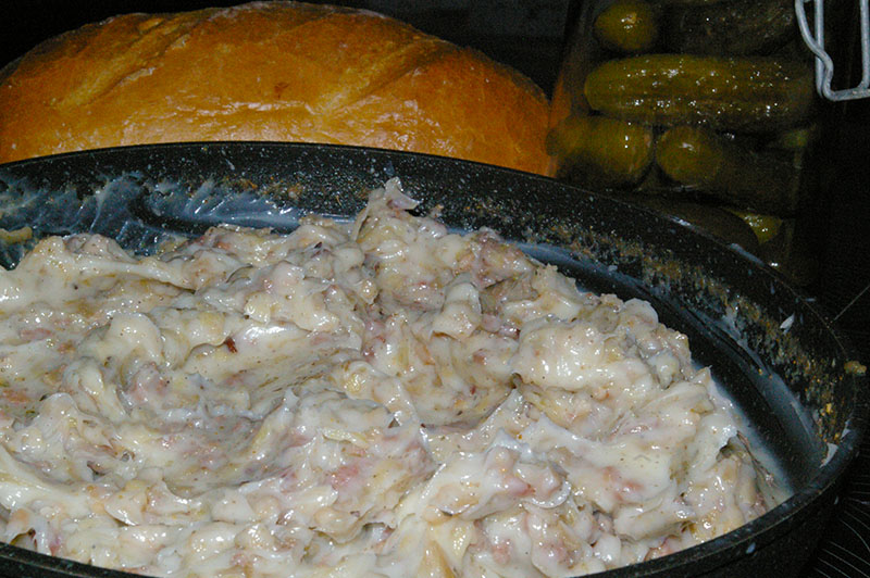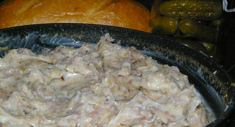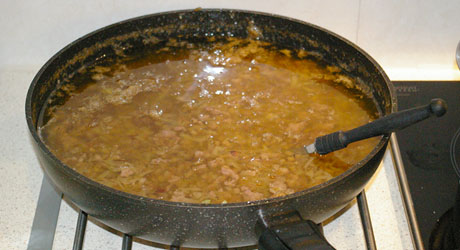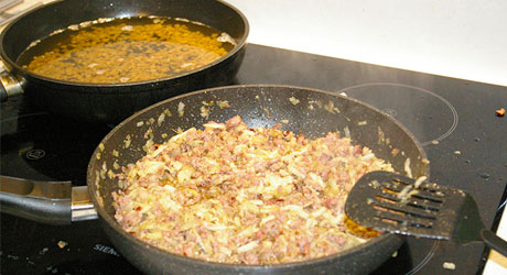 Rozgrzewamy drugą patelnię. Wlewamy na nią kilka łyżek smalcu. Wrzucamy pokrojoną w drobną kostkę cebulę. Gdy się lekko zeszkli dokładamy posiekany drobno czosnek.