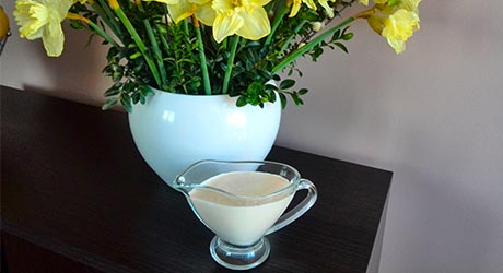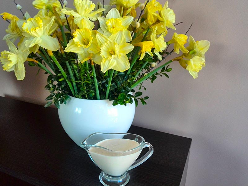 Kupuję tarty chrzan na targu. Nie polecam używania chrzanu typu "śmietankowy" - ma sporo dodatków, często sztucznych i sos z niego nie będzie tak smaczny jak z naturalnego.