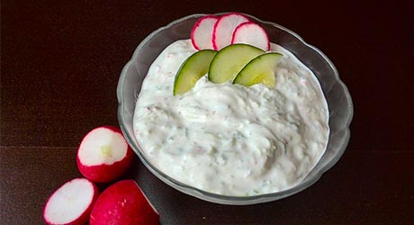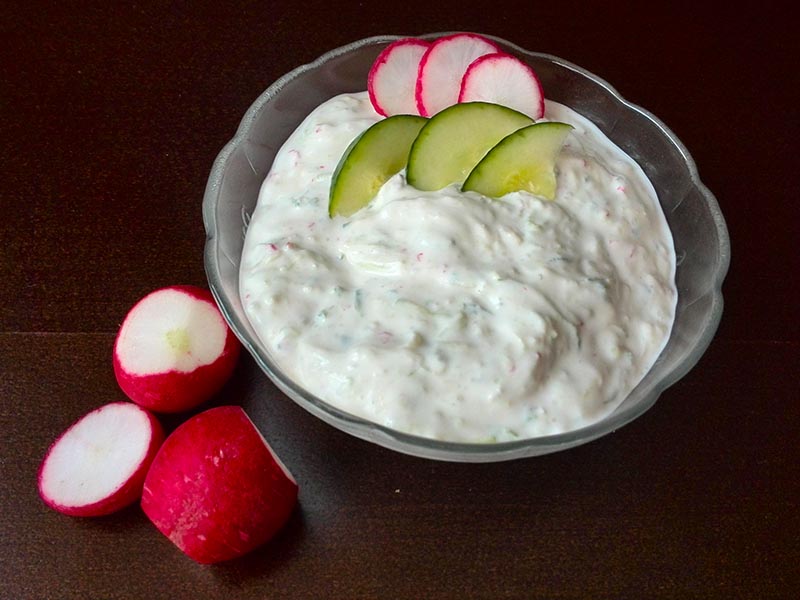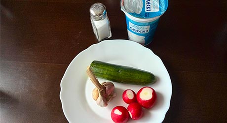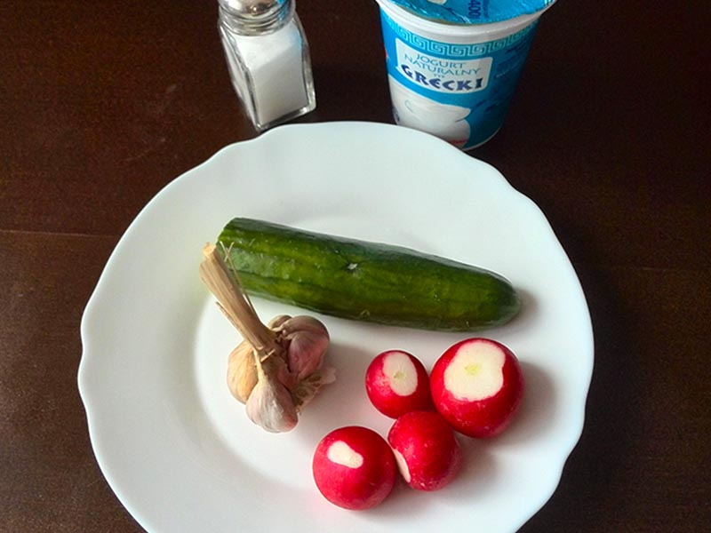 Ogórka i rzodkiewkę lekko odciskamy i łączmy z czosnkowym jogurtem. Dosalamy do smaku.