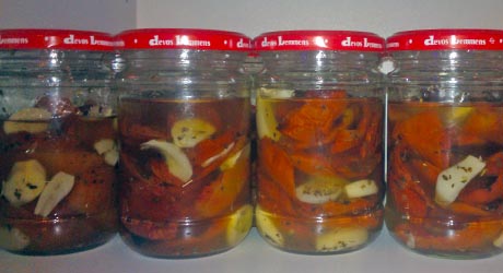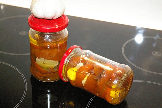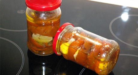 Do każdego słoika wkładamy na przemian pomidory i pięć ząbków czosnku. Olej zagotowujemy i wrzącym zalewamy pomidory. Zanim weźmiemy się za zakręcanie przygotujmy coś do chwycenia słoika i zakrętki, ponieważ są piekielnie gorące. Mogą być silikonowe rękawice, ręczniki kuchenne itp. Zakręcamy i stawiamy do góry dnem na ręczniku do wystygnięcia.