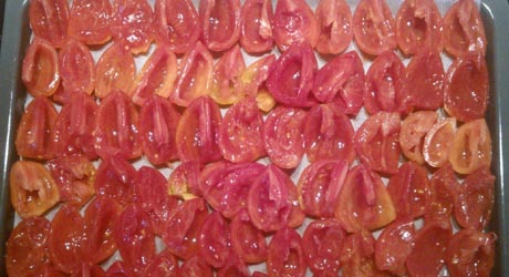 Pomidory myjemy, kroimy na połówki a większe na ćwiartki. Wydrążamy gniazda nasienne. Na blasze rozkładamy papier i układamy pomidory ciasno obok siebie skórką do dołu, solimy. Wstawimy do piekarnika. Najlepiej suszyć je na termoobiegu ustawionym na 120 st. z minimalnie uchylonym piekarnikiem (np. wkładamy między drzwiczki metalową trzepaczkę). Niestety w moim piekarniku termoobieg wyłącza się kiedy otwieram drzwiczki, dlatego stosuję taką metodę suszenia: 1/2 godz. termoobieg 120 st.piekarnik zamknięty, potem 1/2 godz. grzanie góra i dół 120 st. z uchylonym piekarnikiem i tak na zmianę. Chodzi o to, żeby pomidory nie gotowały się, a suszyły. Całość trwa ok 3 godz.