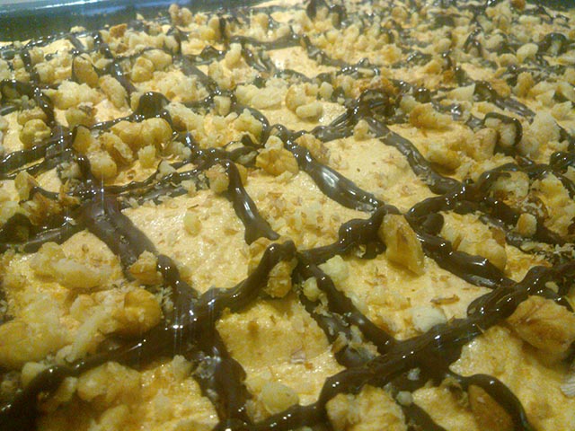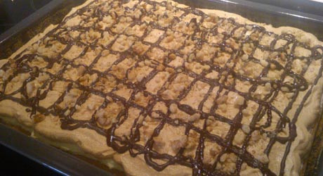 Wystudzone ciasto kroimy wzdłuż na 2 placki. Każdy placek skrapiamy kieliszkiem orzechówki lub wody (można do niej dodać aromat np. migdałowy). Na pierwszy placek nakładamy krem śmietankowy, na to drugi placek i krem kajmakowy. Całość polewamy rozpuszczoną czekoladą i posypujemy rozdrobnionymi orzechami.