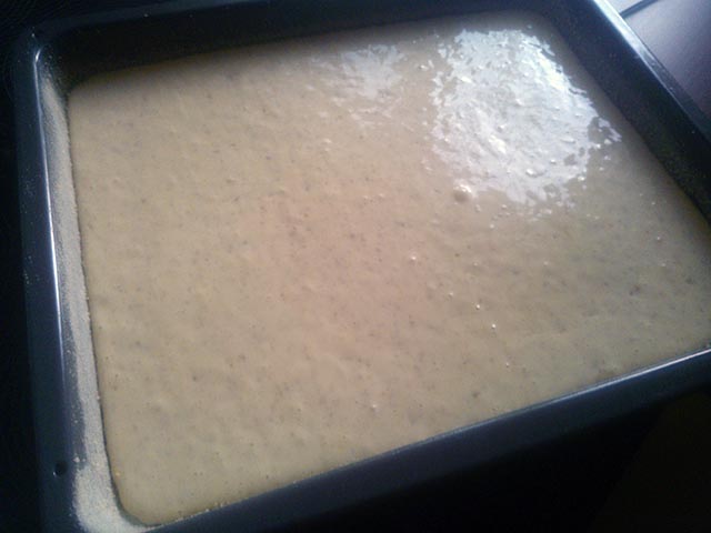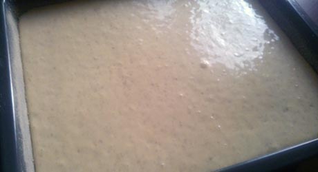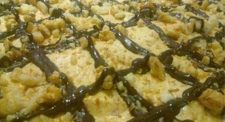 Kiedy potrzebuję więcej kawałków ciasta robię je w wersji jak na zdjęciach. Robię o połowę więcej ciasta (6 jajek, 3/4 szkl. cukru, 1 1/2 szkl. mąki, 1 1/2 łyżeczki proszku, 20 dkg orzechów) i piekę na dużej blasze, takiej z piekarnika. Ciasta nie kroję, nasączam je, nakładam na nie masę śmietankową, a na nią kajmakową, polewę i orzechy.
