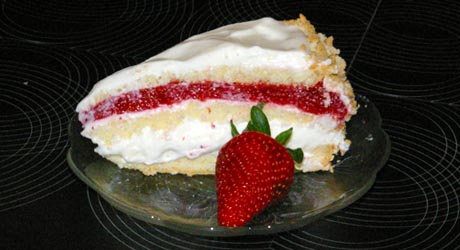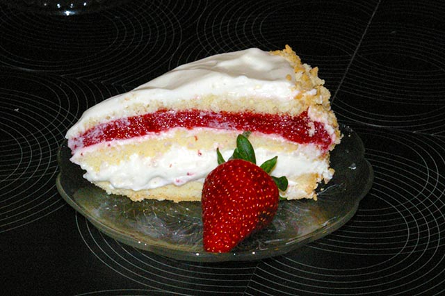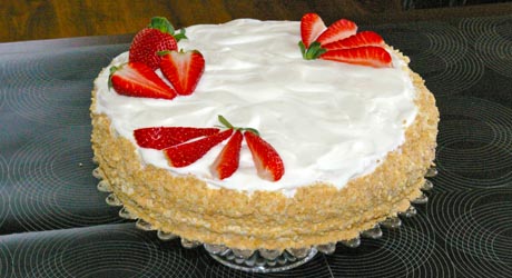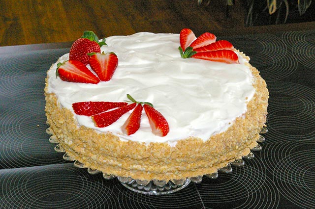 Oddzielamy brzeg toru od obręczy tortownicy nożem i ostrożnie ją zdejmujemy. Smarujemy brzegi kremem śmietanowym, cały pozostały krem wykładamy na górę. Brzegi obsypujemy okruchami. Na górze układamy truskawki.