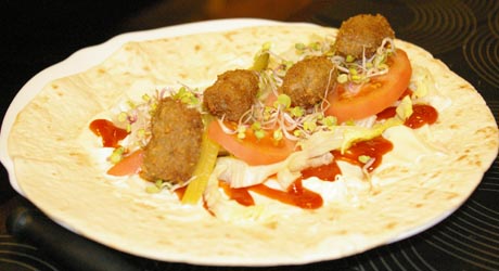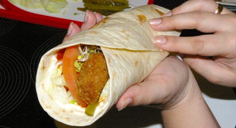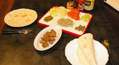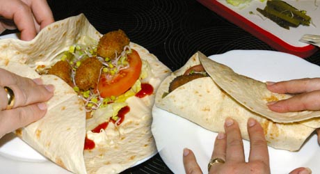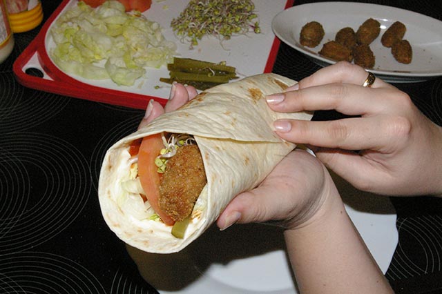 Placek smarujemy sosami. Jeżeli ktoś nie lubi zbyt intensywnych smaków może użyć majonezu i keczupu. Warzywa i mięso w dowolnych proporcjach układamy wzdłuż placka zostawiając na złożenie boki i kawałek u dołu. Posypujemy kiełkami rzodkiewki. Zakładamy dół placka a potem boki formując otwarty u góry rulon. Od momentu otrzymania gorącego placka wszystkie czynności musimy wykonywać bardzo szybko, żeby nie zdążył wystygnąć.