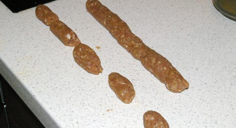 Mięso mieszamy z przyprawami i namoczonym w wodzie chlebem. Formujemy z mięsa wałeczki grubości palca. Żeby mięso się nie kleiło moczymy dłonie. Wałeczki kroimy na mniejsze kawałki długości ok. 3 cm. Jeśli chcemy, żeby były chrupiące obtaczamy w bułce tartej. Smażymy na rozgrzanym oleju kilka minut. Odsączamy na papierowym ręczniku. Podajemy na talerzyku obok warzyw i sosów.