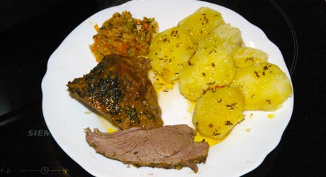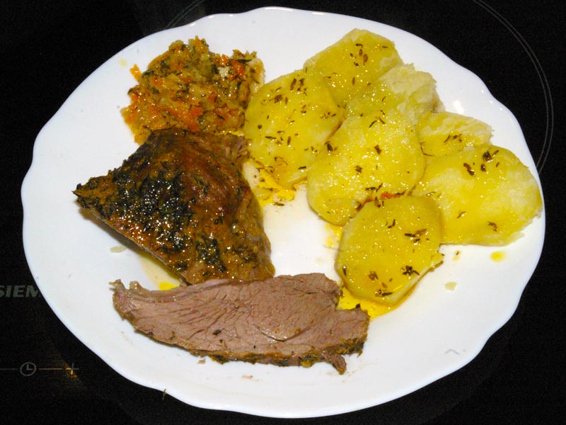 Podajemy z ziemniakami z wody polanymi tłuszczem z pieczenia, obok układamy duszone warzywa.