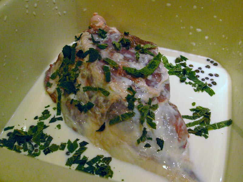 Miętę siekamy na paseczki i nacieramy nią mięso. Udziec razem z miętą wrzucamy do miski i zalewamy mlekiem. Przykrywamy szczelnie workiem i odstawiamy na min. 8 max. 24 godziny. W połowie czasu przewracamy mięso na drugą stronę. Mięta zabije charakterystyczny zapach baraniny a mleko sprawi, że mięso będzie delikatne. Marynata 2:
