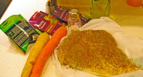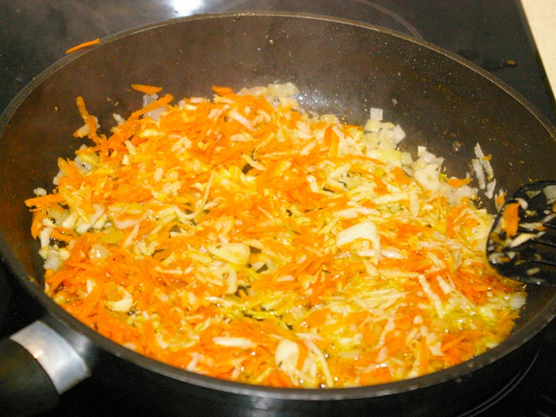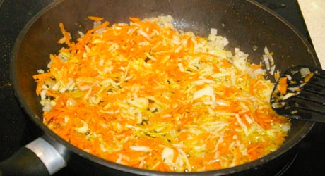 Cebulę kroimy w półplasterki, czosnek w plasterki, marchewkę, pietruszkę i serek w słupki (można też zetrzeć na tarce. Na patelnię, na której smażyliśmy mięso wlewamy jeszcze trochę oleju. Wrzucamy cebulę i czosnek, przesmażamy. Dokładamy pozostałe warzywa i podsmażamy 3 minuty. Wlewamy wodę i musztardę, solimy i zagotowujemy.