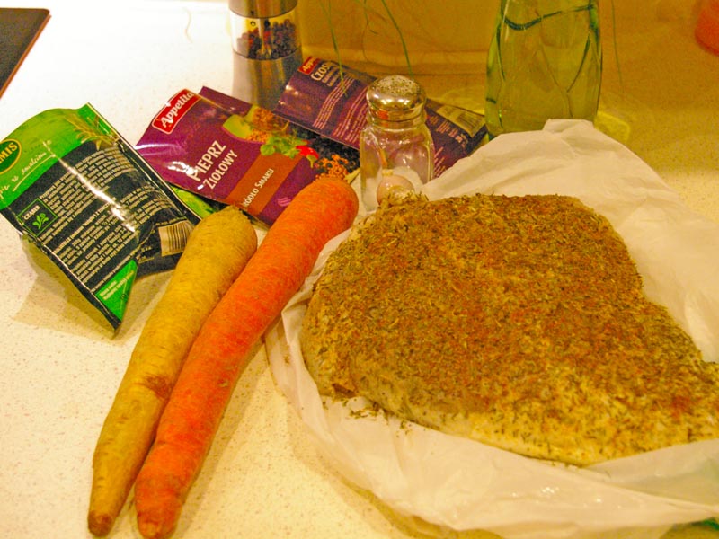 Mięso po wyjęciu z marynaty nacieramy solą, potem olejem, a na koniec posypujemy dużą ilością cząbru, tymianku i czosnku granulowanego oraz trochę mniejszą pieprzu, najlepiej kolorowego. Na patelni rozgrzewamy trochę oleju i obsmażamy mięso po 3 minuty z każdej strony. Zalewa z warzywami