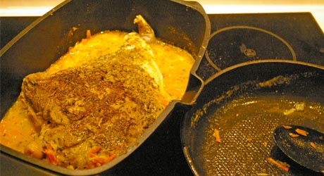 Do żeliwnego naczynia wlewamy zalewę z warzywami i układamy na niej mięso. Przykrywamy. Pieczemy przez godzinę, po czym przekładamy mięso na drugą stronę i pieczemy kolejną godzinę. Zdejmujemy pokrywkę, znowu przekładamy mięso i pieczemy jeszcze 15 minut na termoobiegu.