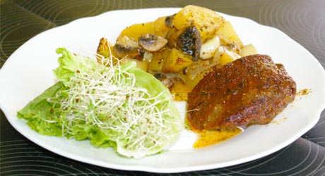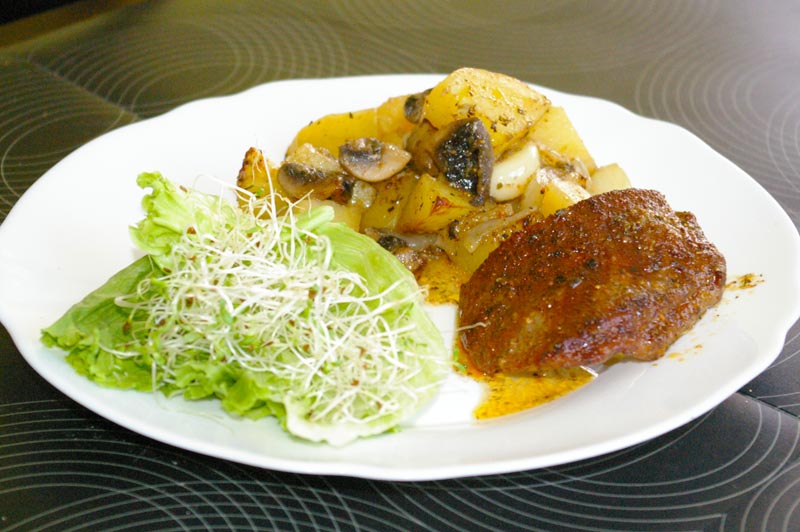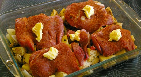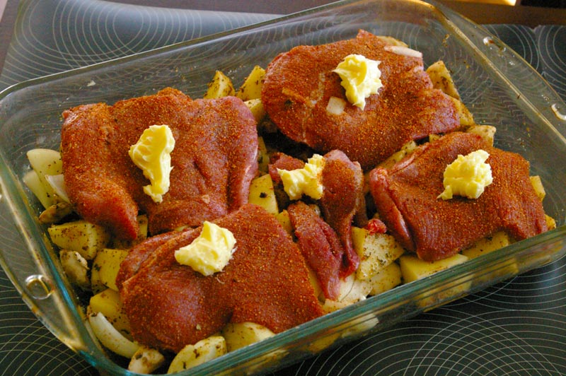 Na warzywach układamy kawałki mięsa, na środek każdego z nich nakładamy po pół łyżeczki masła. Przykrywamy i wstawiamy do nagrzanego piekarnika na 50 minut. Po tym czasie warzywa musimy przemieszać a mięso obrócić na drugą stronę i ponownie nałożyć na każdy kawałek po pół łyżeczki masła. Wstawiamy odkryte i pieczemy 20 minut zmieniając grzanie na termoobieg 200 st.