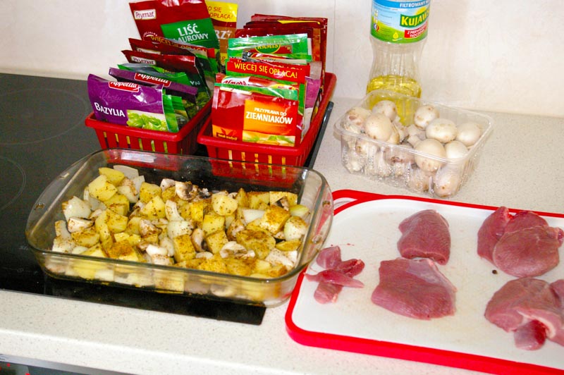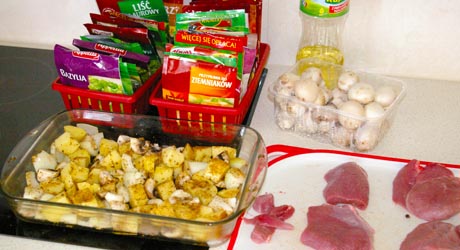 Ziemniaki obieramy i kroimy w dużą kostkę (ok. 3 cm). Pieczarki kroimy na 4 a cebulę na 8 części. Czosnek obieramy i używamy całych ząbków. Wszystkie warzywa wrzucamy do naczynia żaroodpornego, posypujemy przyprawą do ziemniaków, bazylią i troszkę solimy. Polewamy olejem i dokładnie mieszamy.