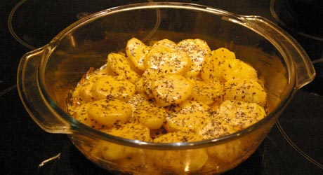 Ziemniaki obieramy i gotujemy w całości w osolonej wodzie przez 20 minut. Po ugotowaniu kroimy na centymetrowe plasterki.