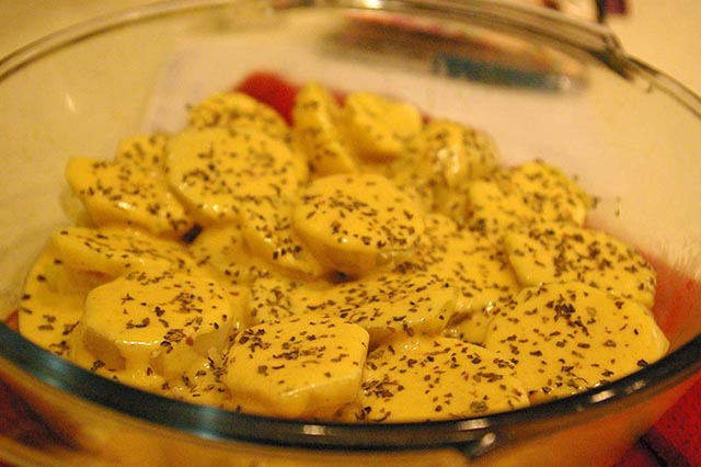 Na dno żaroodpornego naczynia wlewamy trochę sosu, układamy talarki ziemniaków, polewamy sosem i posypujemy bazylią i tak na zmianę.